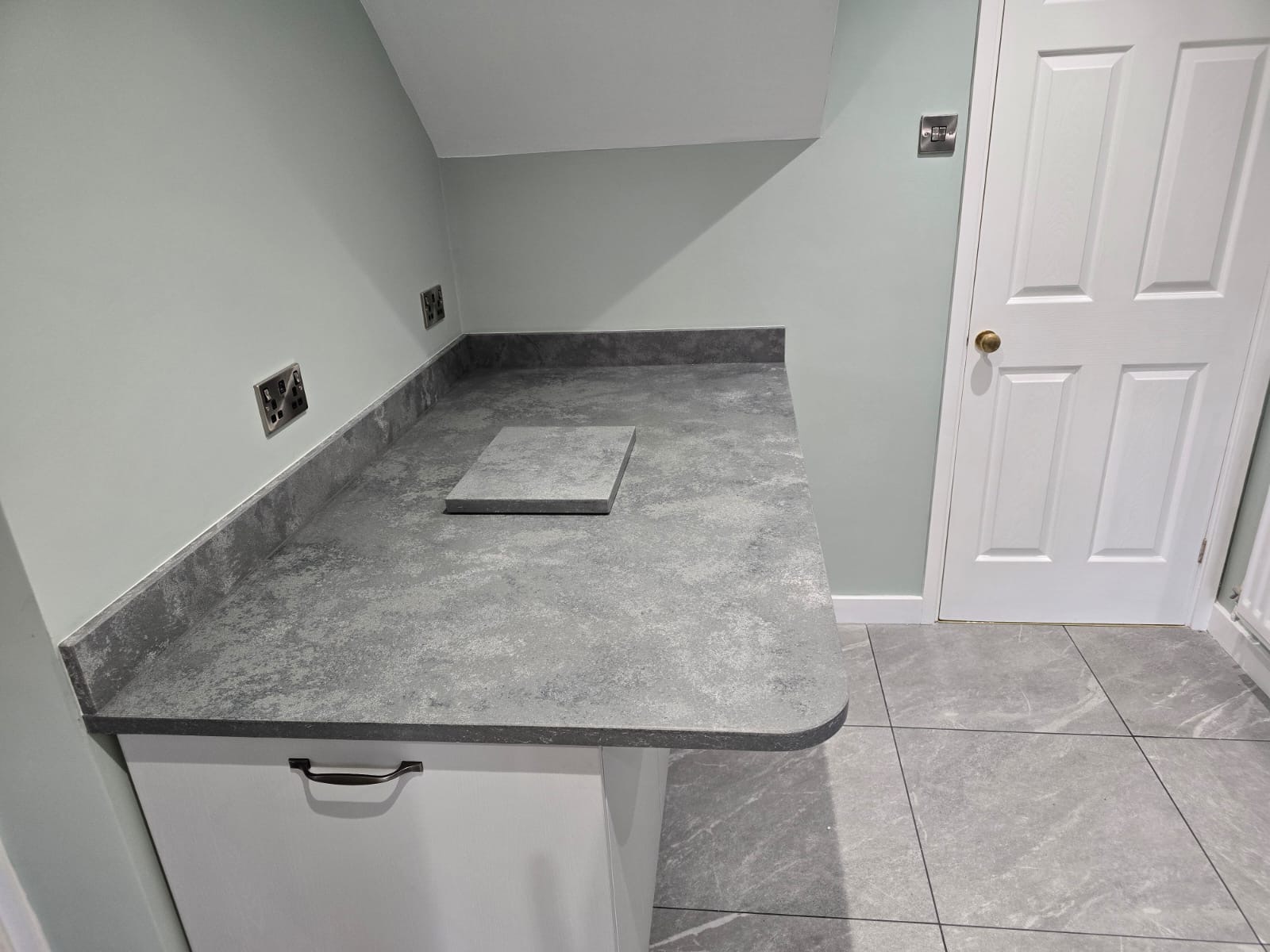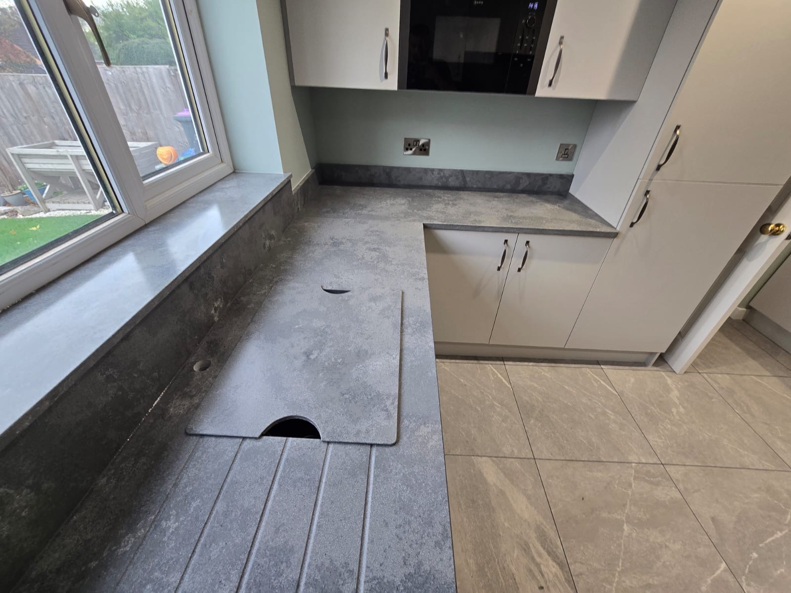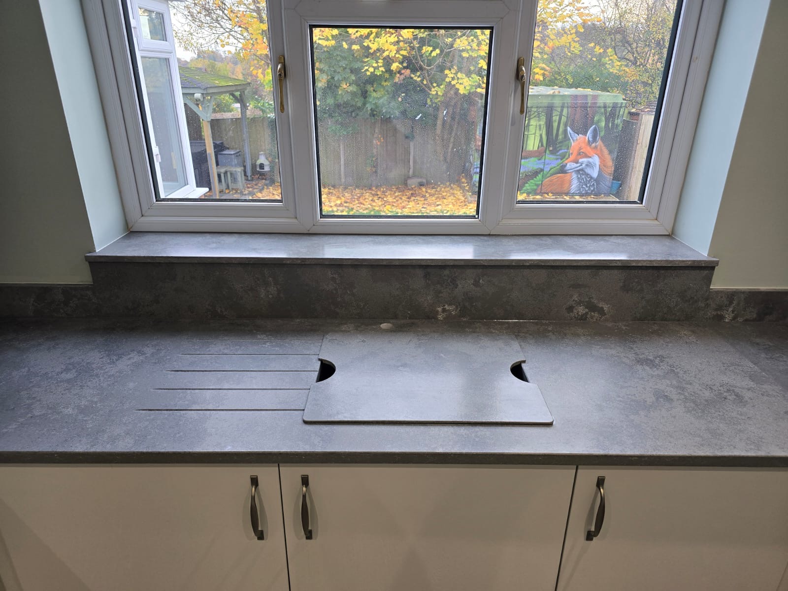 U-shaped kitchen with full backsplash and upstands, sink with cover and drainer grooves.