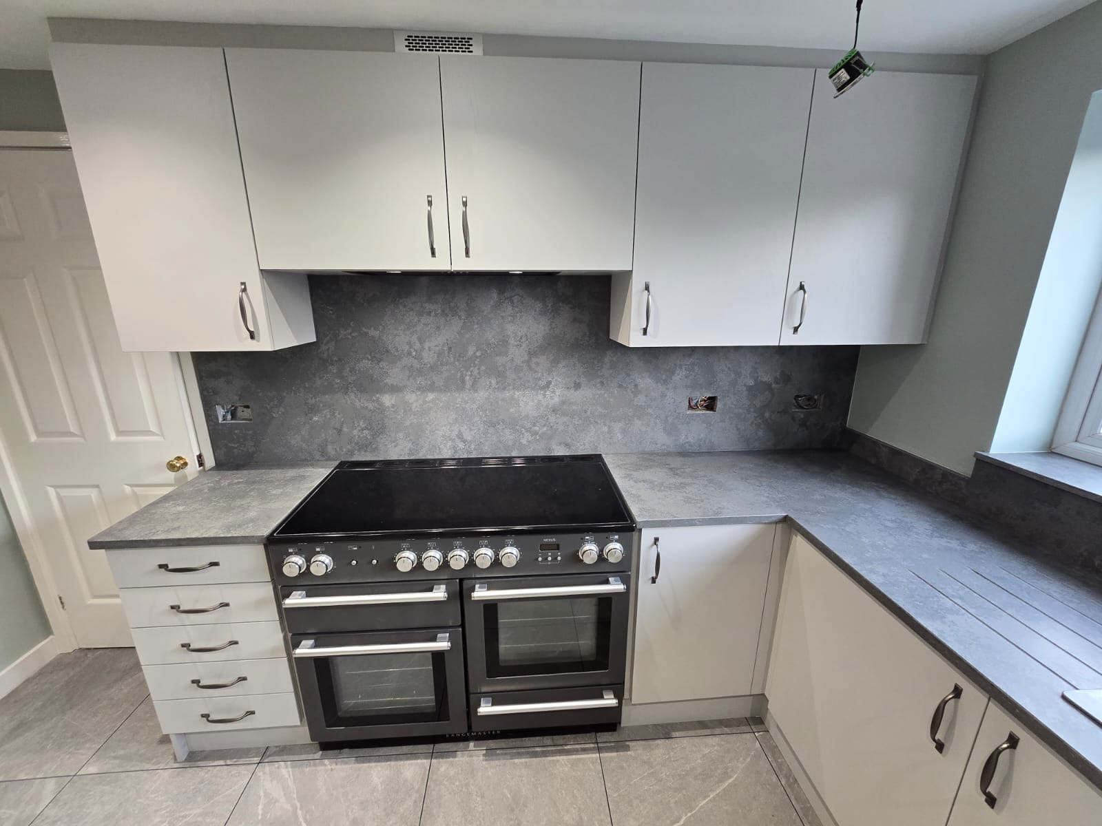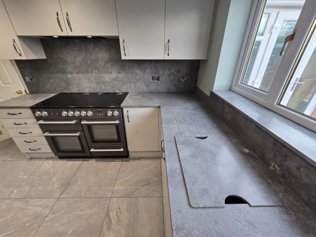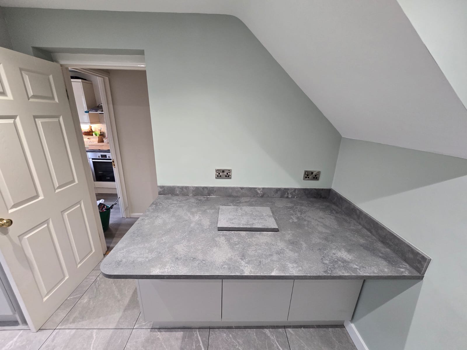 U-shaped kitchen with full backsplash and upstands, sink with cover and drainer grooves.
