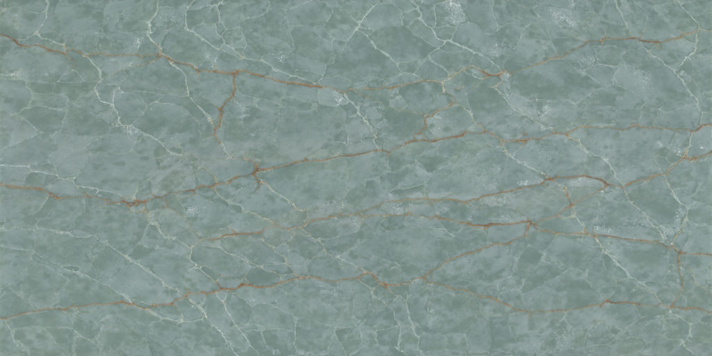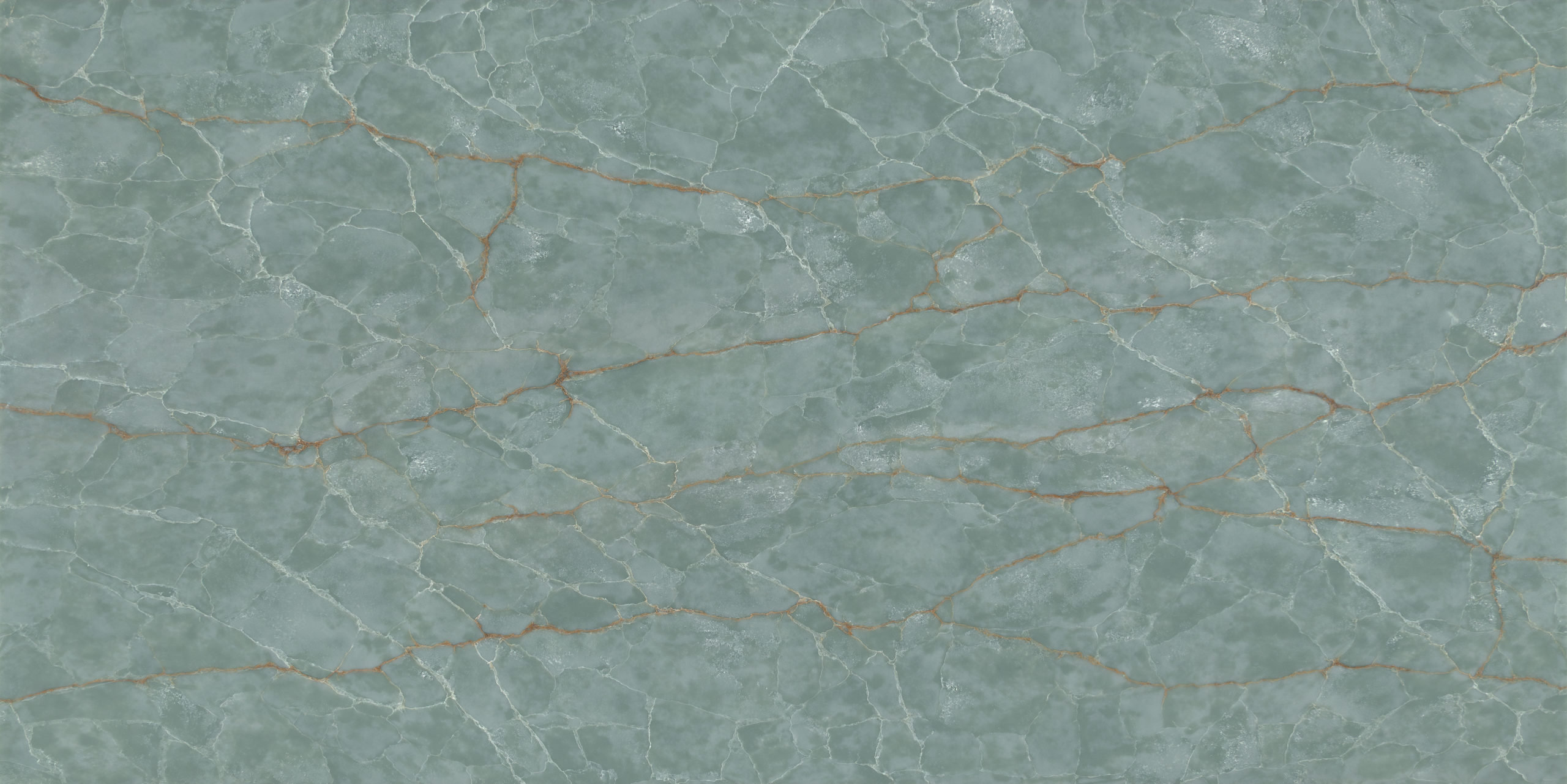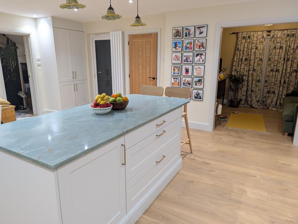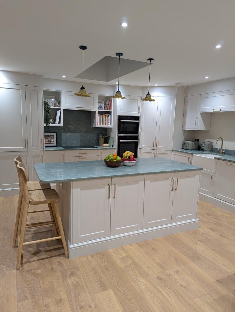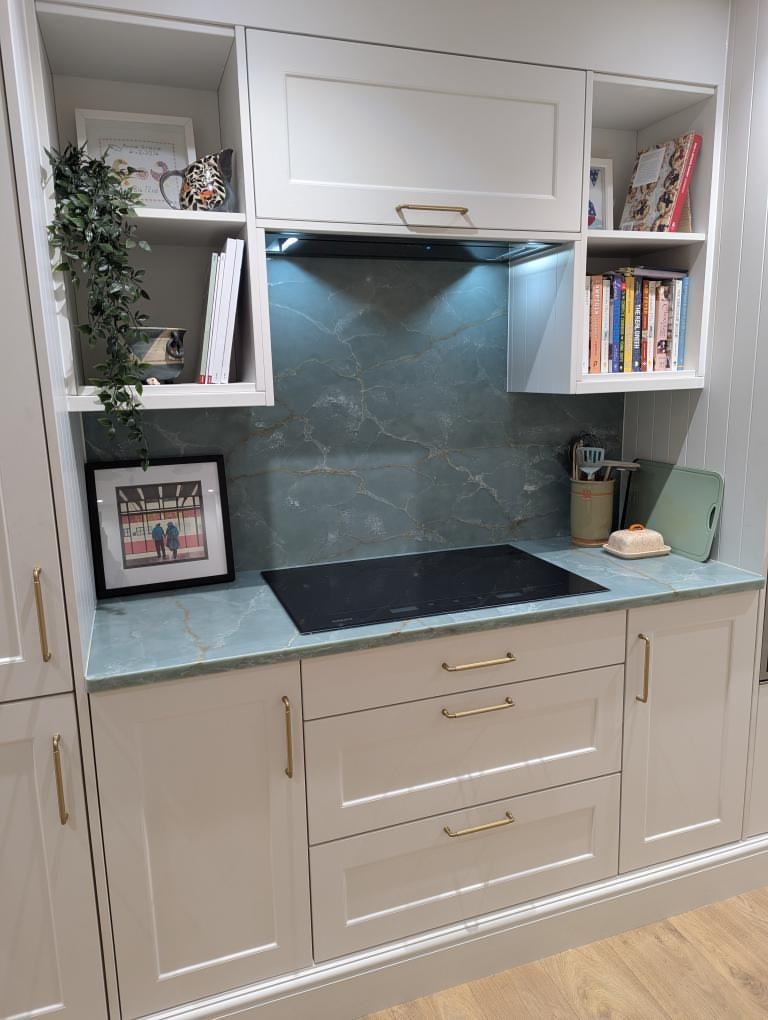 Kitchen island with overhang, hob section with full backsplash, section with belfast sink and upstands in Veridian.
